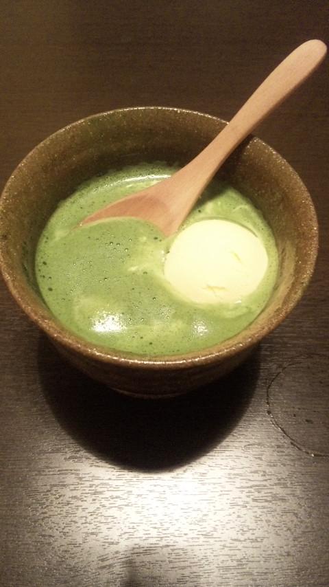 見にくいかもしれませんが、抹茶の中にバニラアイスと白玉がインされています